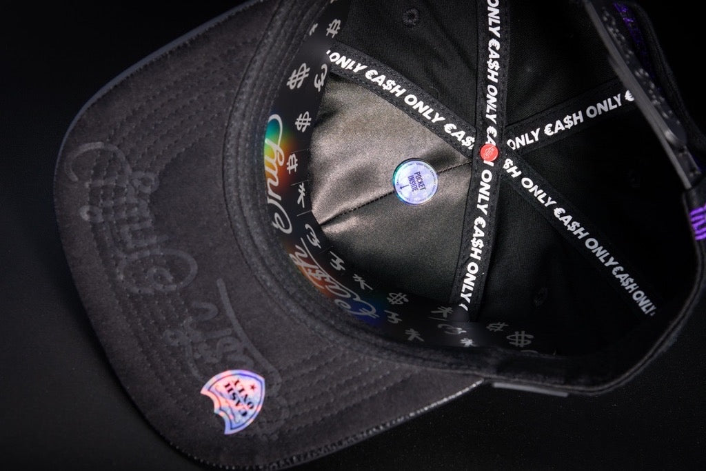 Chaque détail a été pensé pour sublimer cette casquette : broderie grecque à l’arrière en fil violet électrique, poche secrète intégrée, visière plate avec logo Cash Only embossé, et doublure intérieure exclusive marquée de devises et du nom de la marque. Une finition haut de gamme pour un style affirmé.